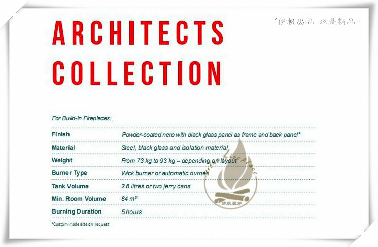 工藝材質(zhì)、功能 | 黑色鋼板 配備全自動酒精壁爐芯 德國肖特耐高溫玻璃 自動添加酒精-外置酒精儲存罐 全自動點火 全自動關(guān)機 無線遙控控制 燃料在火焰燃燒槽傳感器 濕度傳感器(在關(guān)鍵位置的泄漏傳感器) 防溢出保護 溫度傳感器 (沒有火焰自動斷電或者溫度過熱自動斷電) 8小時自動斷電 聲誤差信號 |